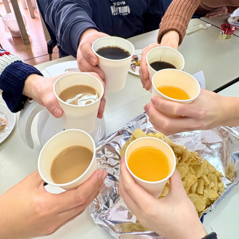 お菓子やジュースを手に、笑顔で談笑している雰囲気が伝わるでしょうか?